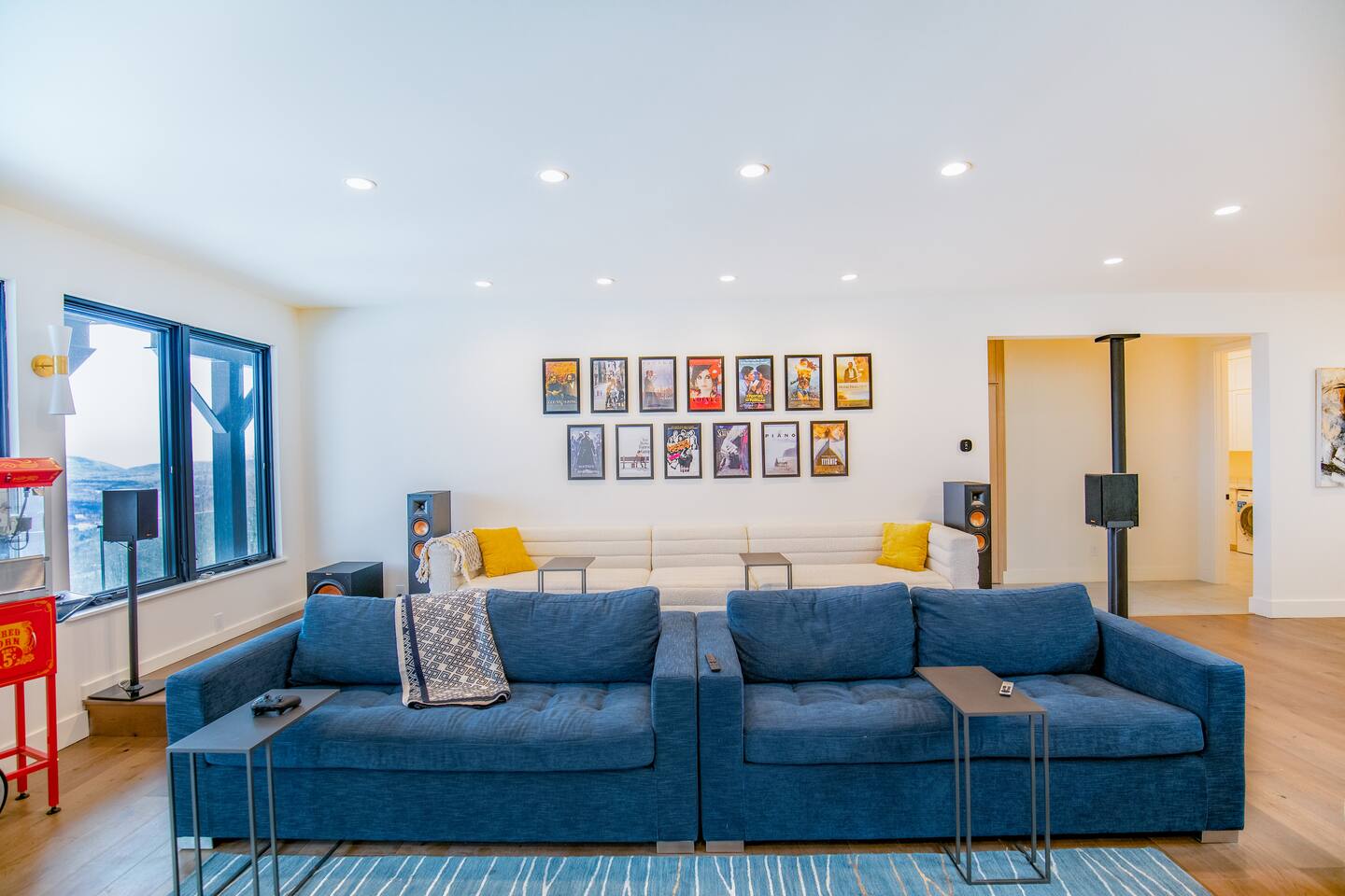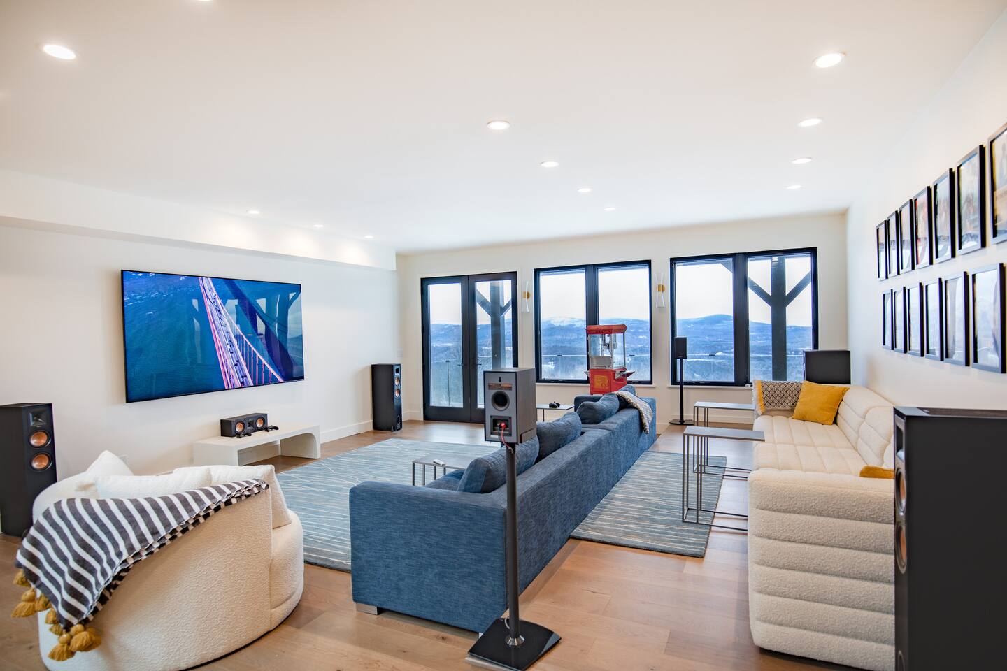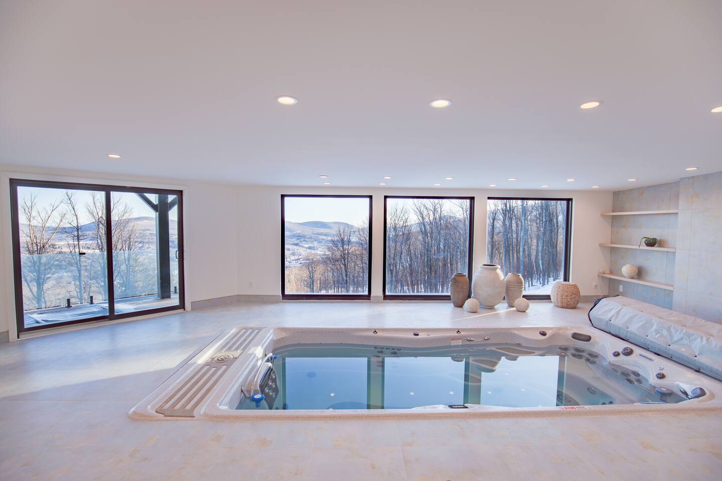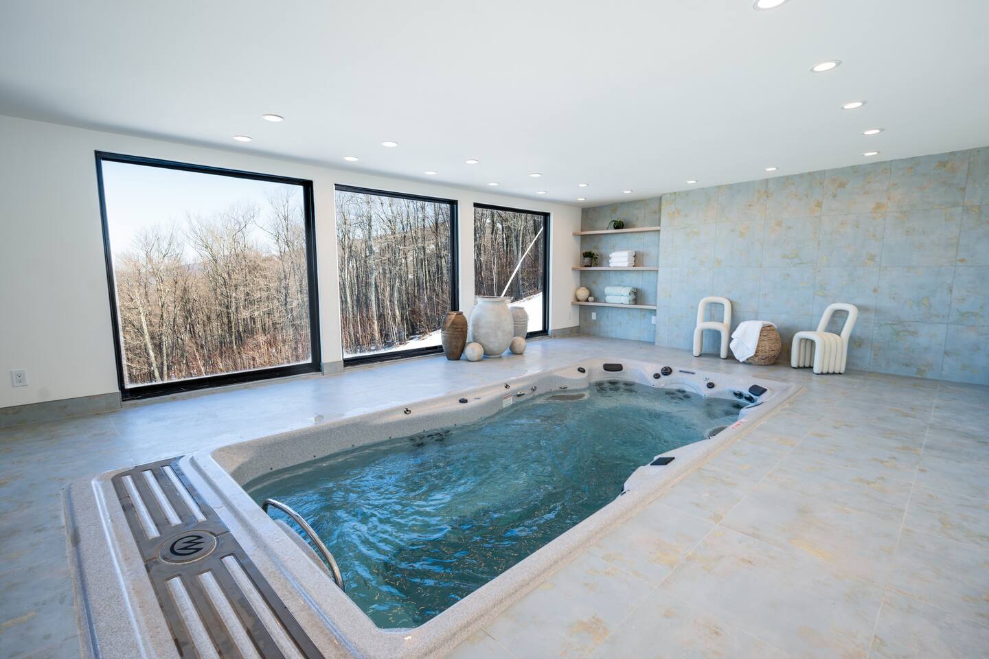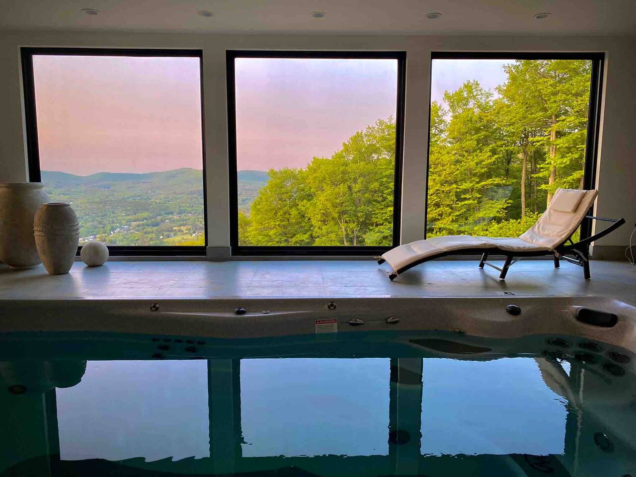 Featuring private swimming pool room, massage, steam shower, Dolby Atmos movie room with 100-inch 4K ultra high def TV, video gaming, gourmet kitchen, en-suite rooms, view wrap-around decks, full smart-home features and direct ski in/out trail access at the top of Windham Mountain Resort. “The View” is a unique space for a retreat in style. Finished in 2022, this luxury modern mountain smart home brings the wonderful outside into every room, with walls of glass bathing the space of natural lights and nano-windows for a seamless merge with the landscape in the warmer seasons. Two huge wrap around decks directly connect to three trails for skiing, hiking, and mountain biking., A pool room with a 20-ft swim spa of continuous streams will wow from beginners to professional swimmers. Also featuring hydro massage jets and a massage chair to relax and decompress. A movie theater with a 100-inch, 4K UHD state-of-the art Dolby Atmos system of 11 channels with every streaming services to find flicks and TV shows for all ages and moods. A Yamaha grand piano for private recitals with silent feature for practice, and a kitchenette with wine cooler for entertaining plus gourmet kitchen in the main level for the culinary enthusiasts. The bedrooms have been styled and furnished with high quality modern furniture, organic linen and environmentally friendly materials to accentuate the natural and eye pleasing decor. The smart features take the stress off with the automation of lights, door locks, with Apple Siri services that realize a next-gen experience in living and comfort.
